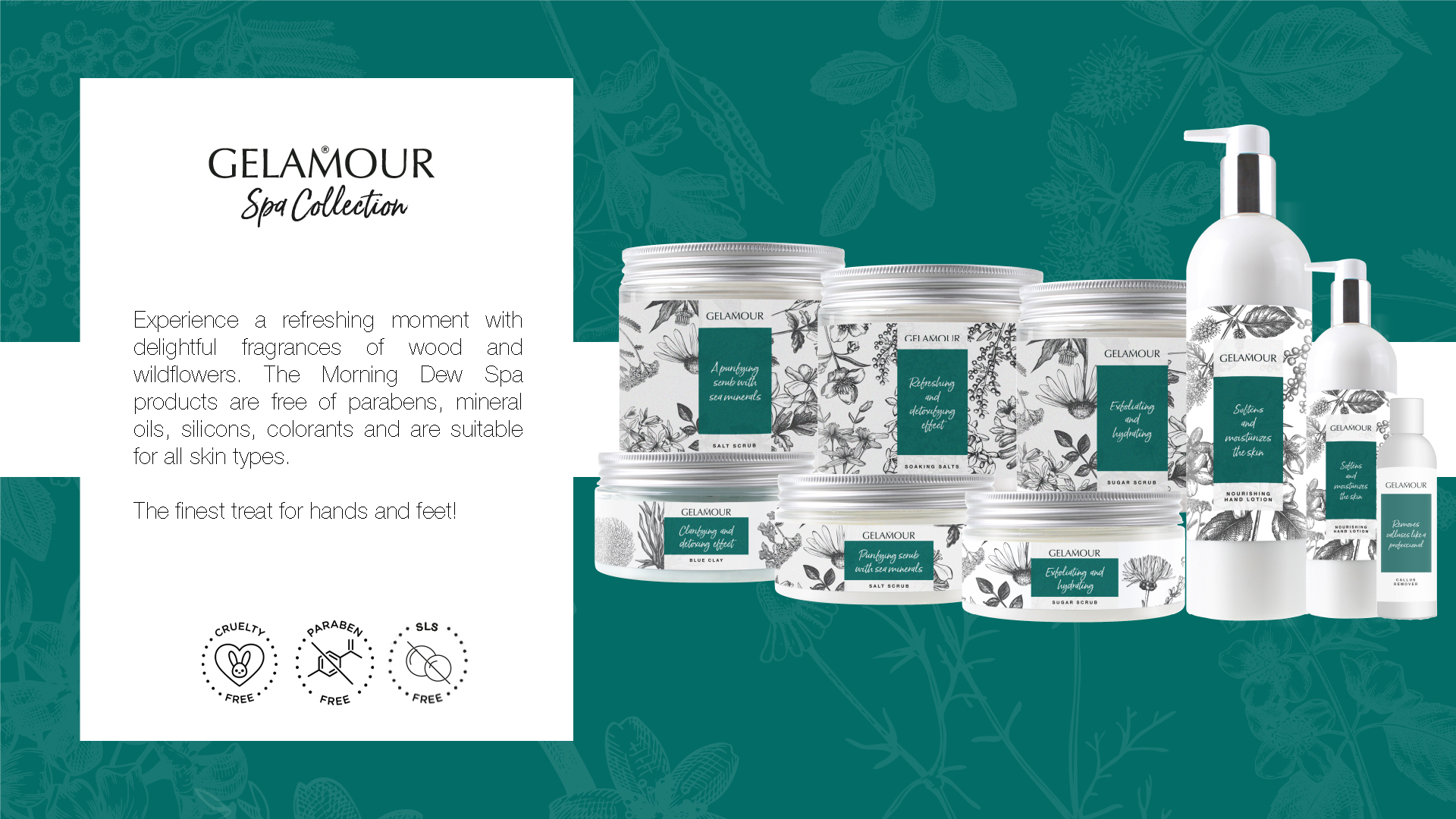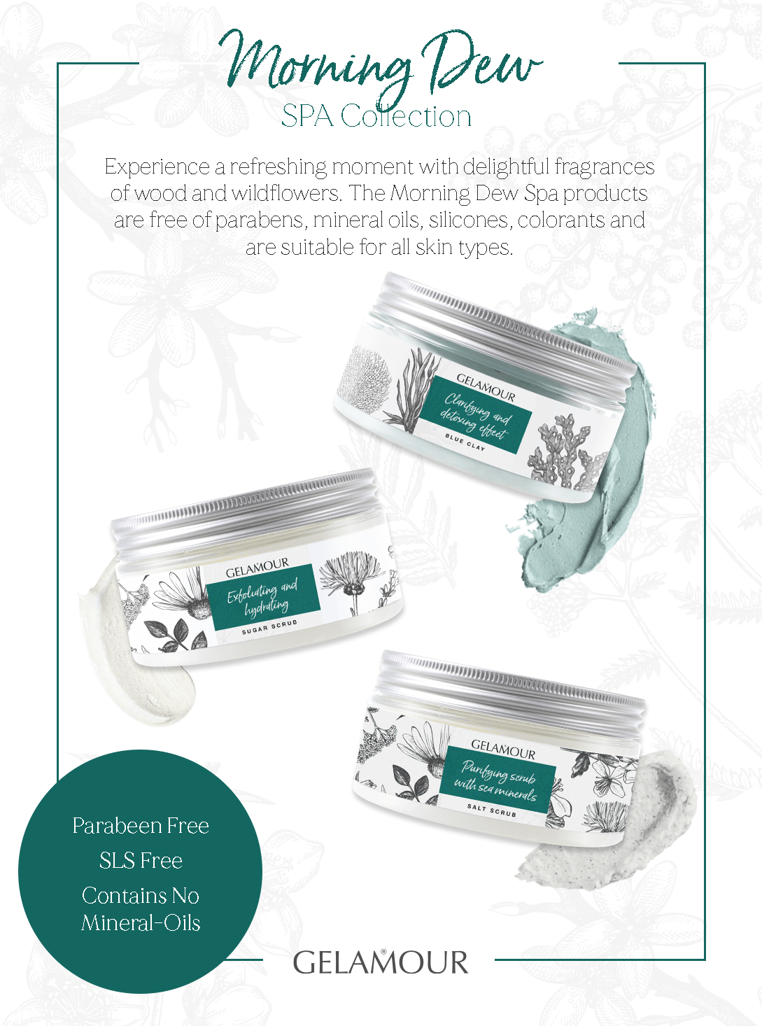 The ultimate freshness of the first part of the day is captured in the Morning Dew line. Experience a refreshing moment with delightful fragrances of wood and wildflowers. The Morning Dew Spa products are free of parabens, mineral oils, silicones, colorants and are suitable for all skin types.